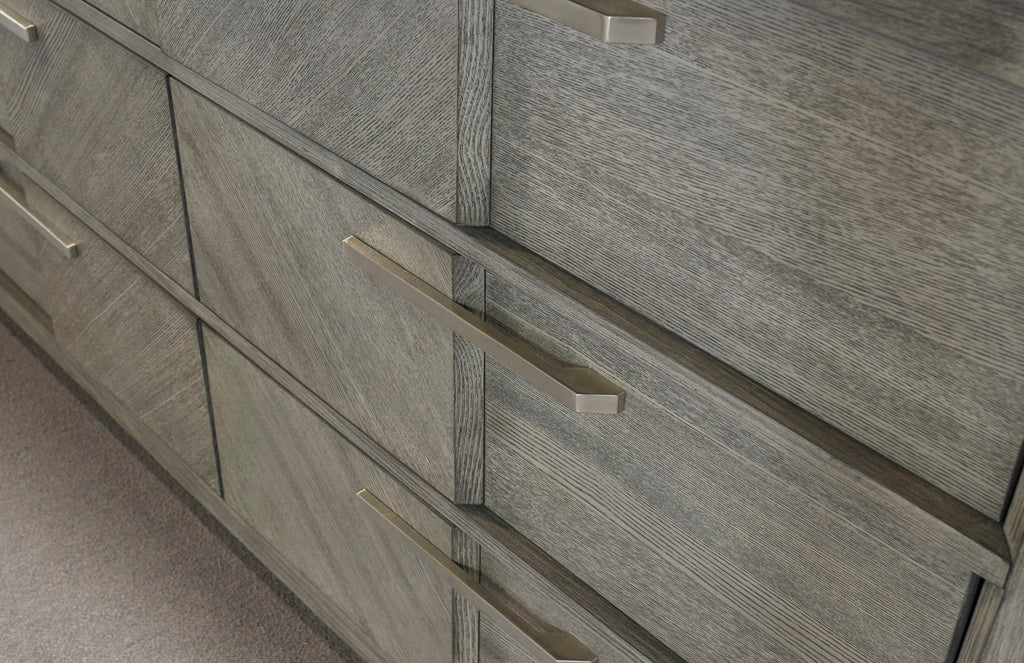 The Bernards Aries 6 Drawer Double Dresser Furniture in Gray with book matched ash veneers is a stylish and functional piece that will elevate any modern bedroom. Constructed from high-quality engineered wood and wood materials, this dresser is built to last and boasts a sleek, contemporary design that complements any decor style. Measuring 17.9 inches deep by 66 inches wide by 38 inches high, this double dresser provides ample storage space for all of your clothing and accessories. The six spacious drawers are equipped with ball bearing glides that ensure smooth and easy operation, while the custom hardware adds a unique touch to the piece. The book matched ash veneers on the front of the dresser drawers create a beautiful, eye-catching pattern that adds visual interest to the piece. The gray finish is versatile and complements a wide range of color schemes, making it easy to incorporate into any bedroom. Whether you're looking to update your current bedroom decor or furnishing a new space, the Bernards Aries 6 Drawer Double Dresser Furniture is a stylish and functional choice that will stand the test of time. With its high-quality materials, modern design, ball bearing glides, and custom hardware, this dresser is sure to become a beloved piece in your home.